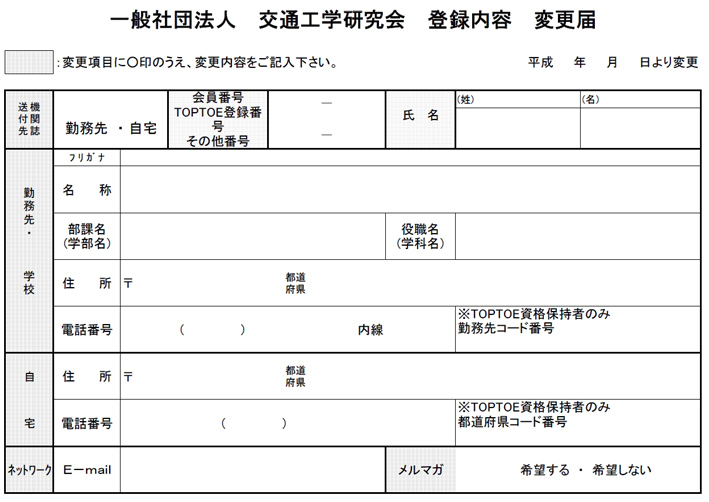 送信先アドレス:info@jste.or.jp Subject:『登録内容変更係』 とお願いします。 送信内容:1.会員番号 2.氏名 3.Eメールアドレス 4.昼間の連絡先TEL 5.変更内容 6.機関誌送付先 7.TOPTOE登録番号 8.TOPTOE保持者のみ、都道府県コード・勤務先等コード