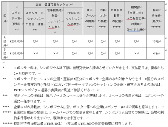 JSTEシンポジウムへのスポンサー参加は、以下のA・B区分からご選択いただけます。